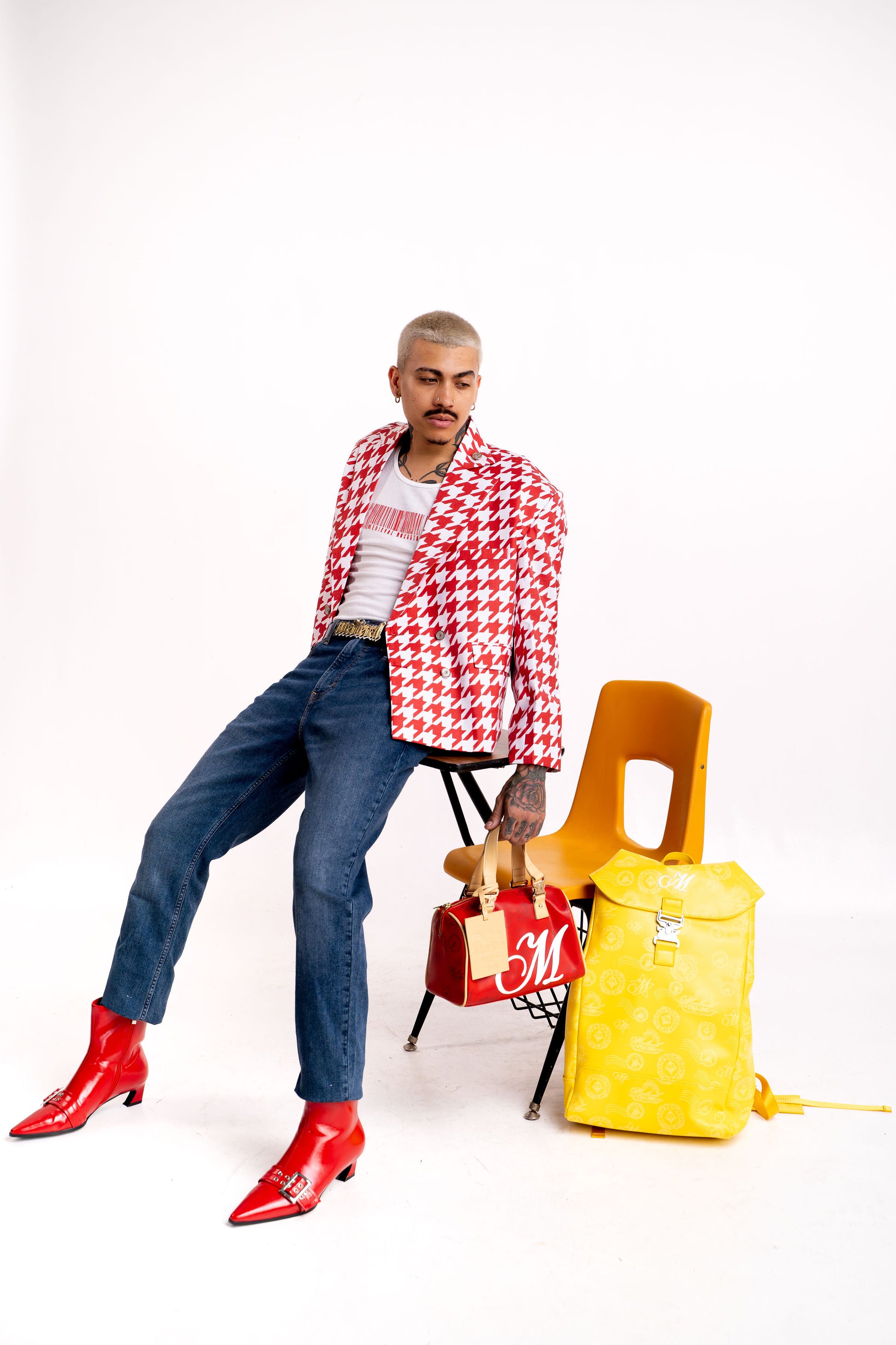 Crafted from premium full-grain leather, this bold yellow backpack is a statement piece built for both luxury and utility. The structured silhouette delivers a refined yet modern presence, while the embossed all-over pattern showcases exclusive insignias that represent heritage and individuality. A large, curved white “M” monogram highlights the front panel, adding a distinctive signature touch.